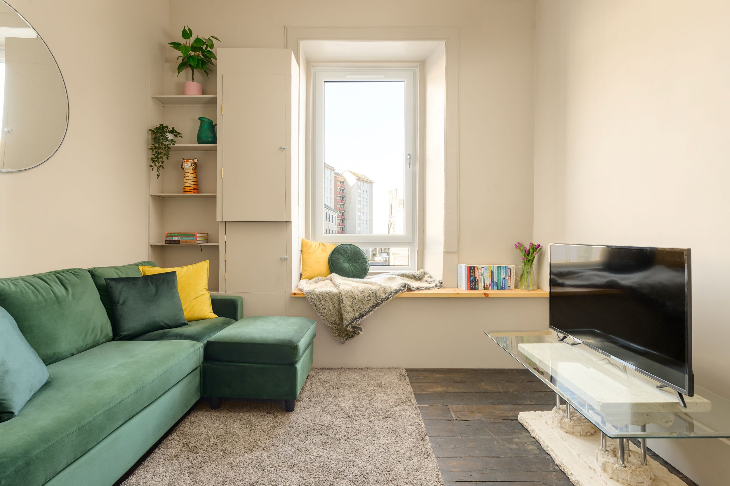 There’s plenty of space to relax in this apartment with its high ceilings, cornicing and large windows. Fix yourself a coffee and watch the world go by from the window seat in the open plan living area. If you feel like a cosy night in, you can whip up something delicious in the fully fitted and equipped kitchen to enjoy at the breakfast bar. Or sample some local whisky and kickback with a movie from the comfort of the sofa.